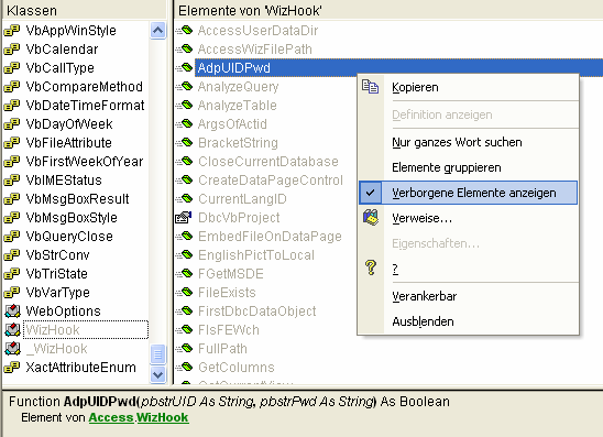 Um an das WizHook-Objekt mit seinen Eigenschaften und Methoden heranzukommen muss man in den VBA-Editor wechseln. Als nächstes muss der Objektkatalog aktiviert werden. Dazu verwendet man den Befehl "Ansicht" / "Objektkatalog". Als Shortcut kann man auch die F2-Taste verwenden. Im Objektkatalog werden alle Objekte mit ihren Eigenschaften und Methoden dargestellt. Ein Objekt mit dem Namen "WizHook" ist aber nicht zu finden. Um das WizHook-Objekt sichtbar zu machen muss man die verborgenen Elemente anzeigen. Dazu klickt man mit der rechten Maustaste irgendwo, wo man keine Auswahl trifft. Aus dem Kontextmenü wählt man "Verborgene Elemente anzeigen". Jetzt werden die versteckten Objekte eingeblendet. Ganz am Ende der Liste findet sich auch das WizHook-Objekt.